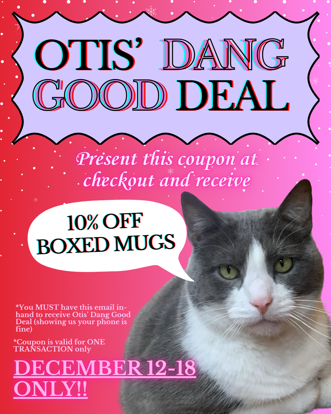 'Tis the season for warm drinks! December 12-18, present this coupon at checkout and receive 1 0% OFF ALL BOXED MUGS found in Otis' Old Curiosity Shop. This includes our limited-edition Jolabokaflod mugs -- join us for our annual Jolabokaflod read-in on December 17, and pick up some lovely (and discounted!) drinkware while you're at it.